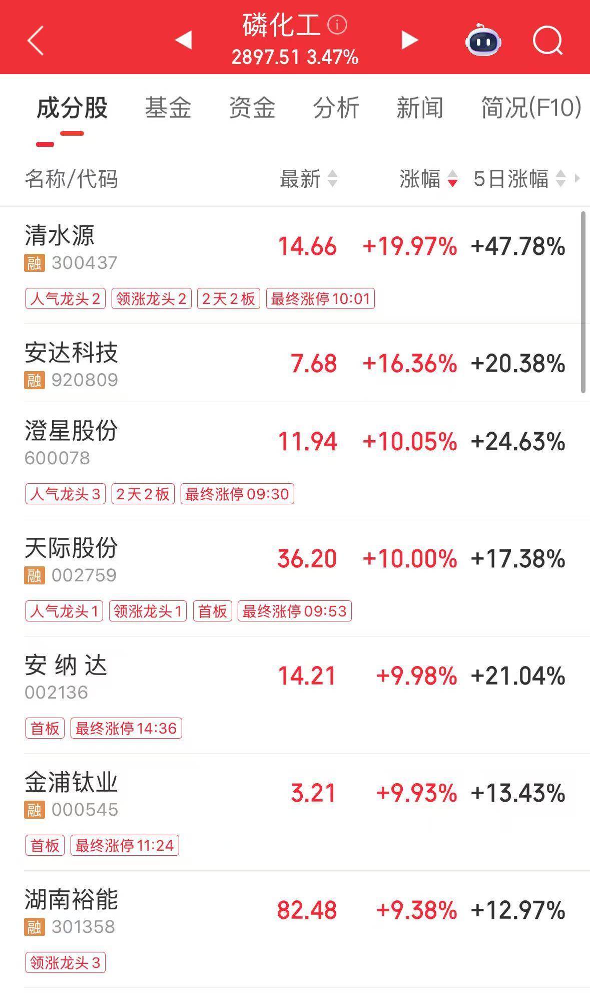 11月7日哈福配资,磷化工板块表现强势,截至收盘涨超3%。个股方面,清水源(300437.SZ)连续两日收获20cm涨停,澄星股份(600078.SH)亦实现2天2板,天际股份(002759.SZ)、安纳达(002136.SZ)、金浦钛业(000545.SZ)均涨停。